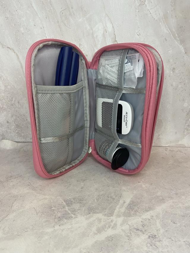 Діа-органайзер має два зручних відділення, в яких легко помістяться ваші діа-аксесуари та гаджети. Перше відділення розділене для шприц-ручок, глюкометра та витратних матеріалів. Друге відділення загальне — без додаткових кишеньок.